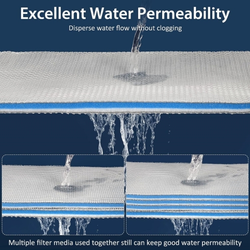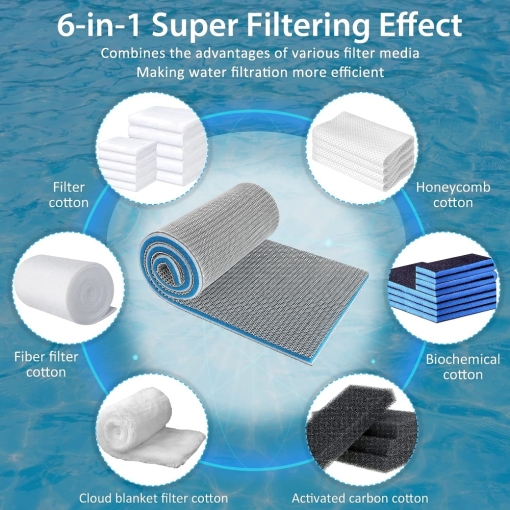 Aquarium Filter Pad has 8 layers filter media: 2 * 3d honeycomb mesh cloth, 2 * Stereo hydrophobic fiber cotton, 2 * Carbon fiber cotton, 1 * Nano biochemical cotton, 1 * Fiber biochemical cotton. The 3d honeycomb mesh cloth traps larger particles, the stereo hydrophobic fiber cotton traps fine particles, others filter out very fine impurities and odors. All of them work together to provide high efficiency filtration.