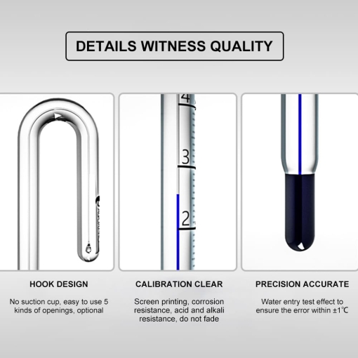 This product is a hook design without suction cups, suitable for fish tanks of different thicknesses, easy to use, made of high-quality glass, crystal clear screen printing to form a glazed effect after heat treatment, corrosion resistance, acid and alkali resistance, no fading, no bubbles, no miscellaneous spots, The water entry test effect ensures accurate accuracy, and the scale in the water is clear and easy to observe the temperature.