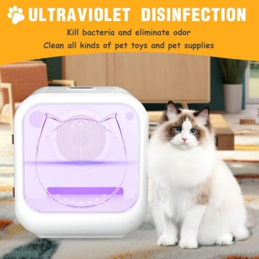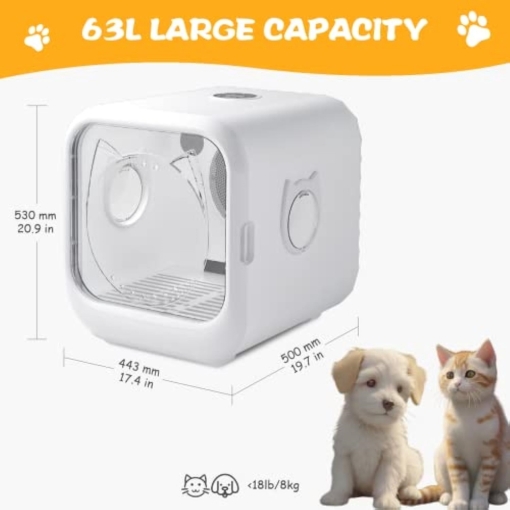 ?Spacious Capacity for Various Pets – Boasting a generous 63-liter capacity, this automatic pet dryer can accommodate different types of pets, including cats and small dogs, providing ample space for them to move around. The 16.9L x 14.6W x 15.6H inch interior can even hold two pets weighing up to 22 lbs each for simultaneous drying.