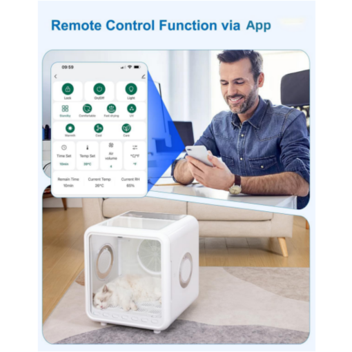 【Smart Pet Dryer Box】Faushun hair dryer box is a group of R&D professionals around pet life to simplify the drying process after bathing and let the fur kids enjoy it while saving you time and freeing your hands. Intelligent pet supplies can be remote via APP to control and adjust the time, wind power, four drying modes and CARE. Door will automatically open after finishing drying, this is a groundbreaking invention, which is a safe, comfortable and efficient for your pet.
