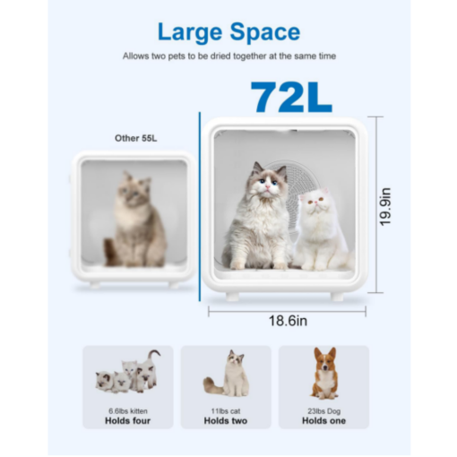 【72L Pet Bed】The pet hair dryer box also doubles as a perfect bed when drying is not needed, in WARM, COOL and CARE modes. A spacious 72L capacity fits cat and kitten families, all breeds of cats and small dogs, providing ample space for them to move around. Two side windows are designed to interact with your pet for comfort during the drying process.
