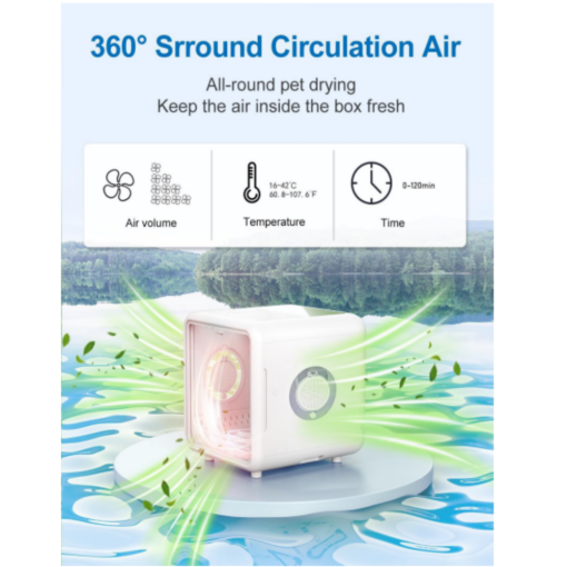 【Efficient Drying】The cat dryer box simulates the car ventilation system, making hot air discharge and fresh air replacement, keeping the box air fresh, let the pet more comfortable and safe inside. It also achieves a true 360° circulating wind with five air vents, the powerful airflow can fully and quickly dry the pet’s fur for reduced drying time. Super large space allows pets to lie down, and the bottom air outlet can also belly hair drying.
