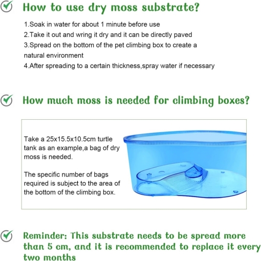 【Carefully selected moss】: Unlike other mosses on the market, our dry mosses are carefully selected and will contain small amounts of impurities, sand and other debris. We ensure that our reptile dried moss goes through a strict quality control procedure to meet our high quality requirements.