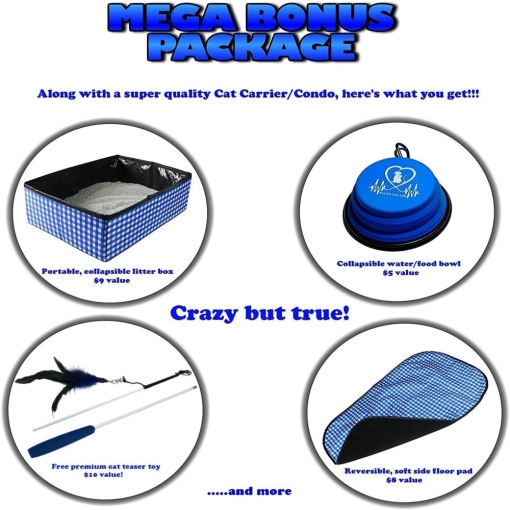 Our car travel cat cage includes a bonus cat feather teaser and portable bowl with every purchase. Our wand is great fun and sure to get your kitty up, running around. The bowl is purrfect for on the road or at home. This “Pet Tent” is a superior value and will greatly improve your cat’s quality of life!