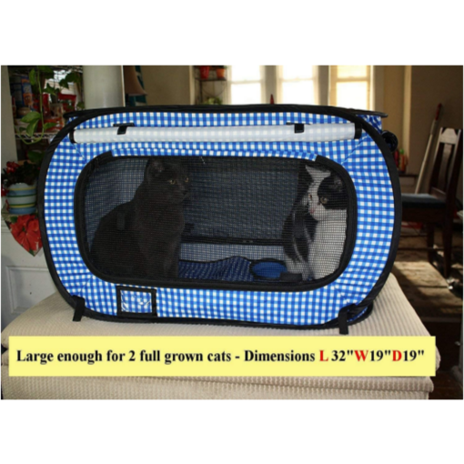 Extra large (32″x19″x19″) soft sided cat cage with portable litter box included (great value for you and your cat!) Large enough to house two full grown cats comfortably. Fully collapsible cat travel bag, purrfect for keeping your cat car-safe and contained when you have company or during emergencies.